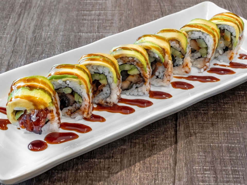 Freshwater eel, cucumber inside, topped with avocado, and eel sauce