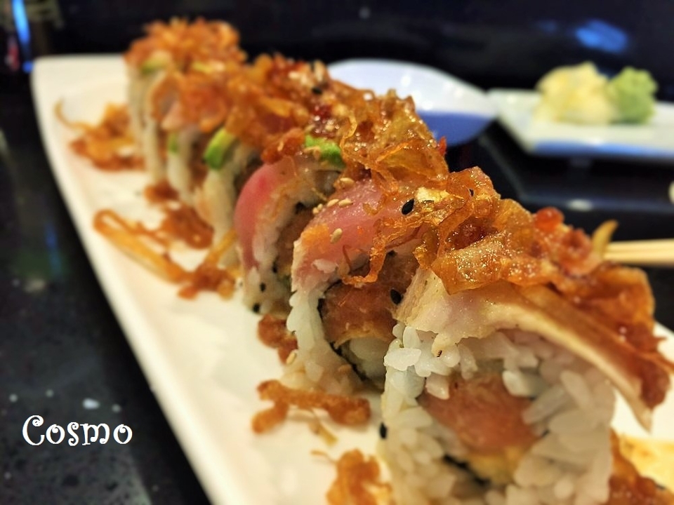 Tempura roll stuffed with spicy Tuna, avocado, cream cheese, and white fish; served with eel sauce, spicy mayo, masago, onion