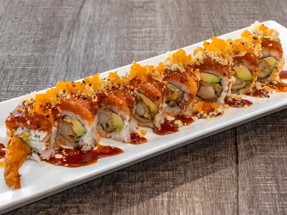 Shrimp tempura and spicy shrimp &crab inside, topped with tuna, avocado, and seared spicy tuna w/ spicy mayo, eel sauce, masago, and green onion