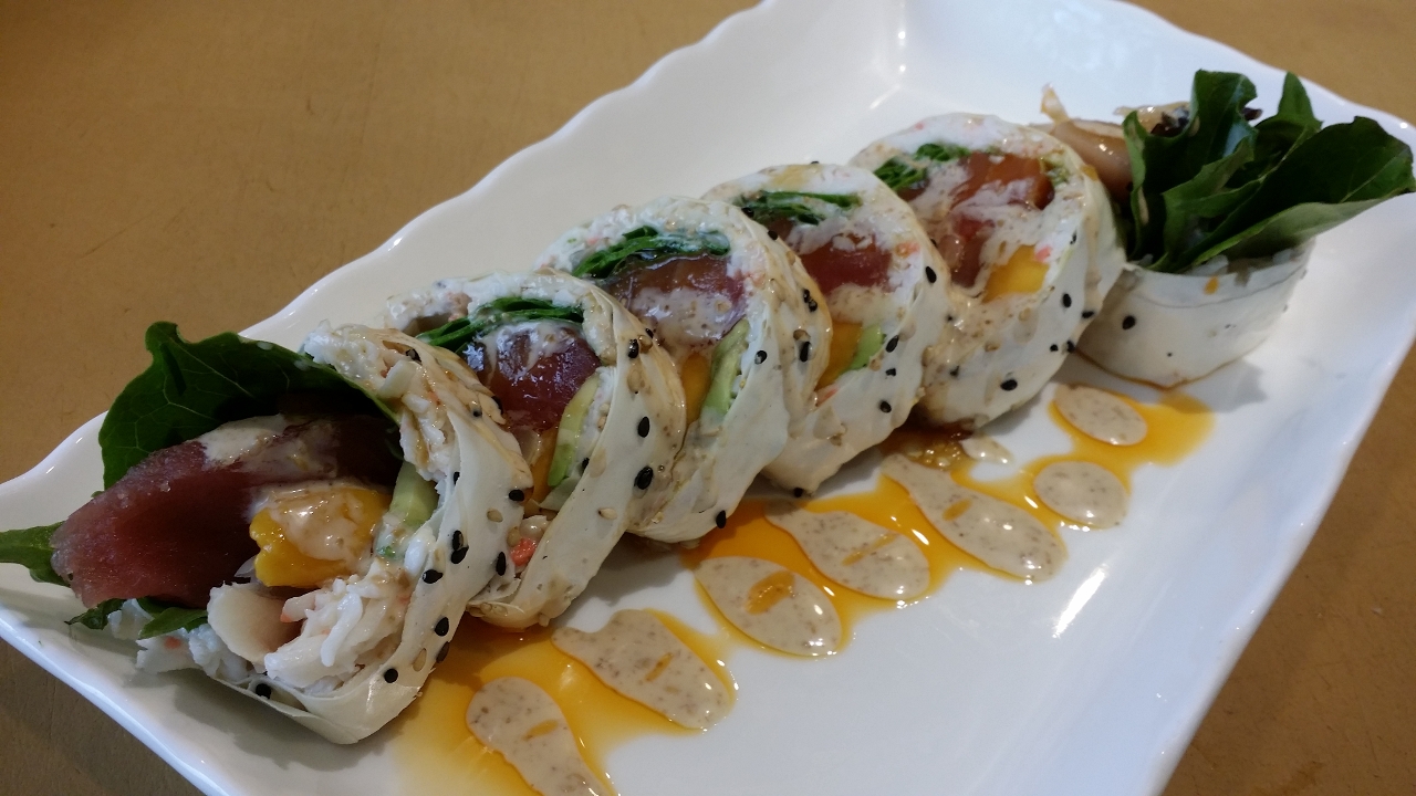 [Roll with no rice] Tuna, salmon, yellowtail, crab salad, spring mix, mango, and avocado wrapped in soy paper; topped with creamy sesame dressing, chili oil, and special ponzu sauce