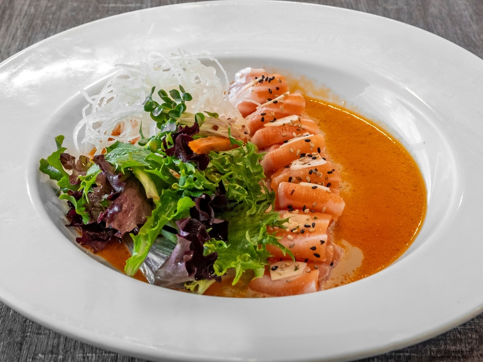 Spicy tuna, shrimp tempura, avocado in soy paper; topped with yellowtail, salmon, jalapeno, fresh red onion, and ceviche sauce