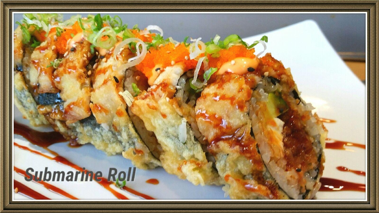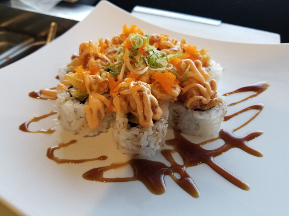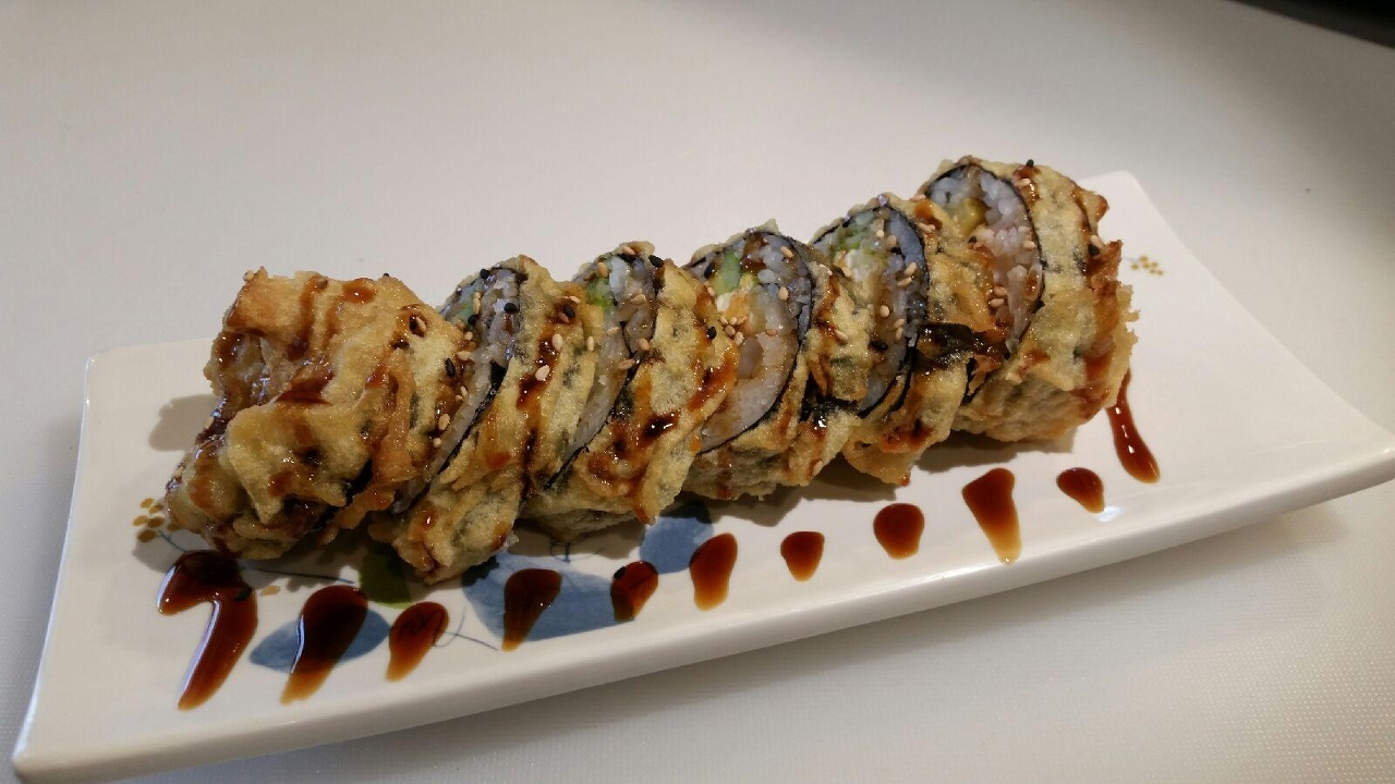Shrimp tempura, imitation crab, avocado, cream cheese and jalapeño inside; deep-fried and eel sauce on top