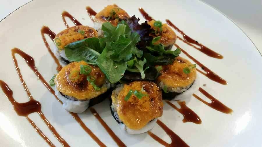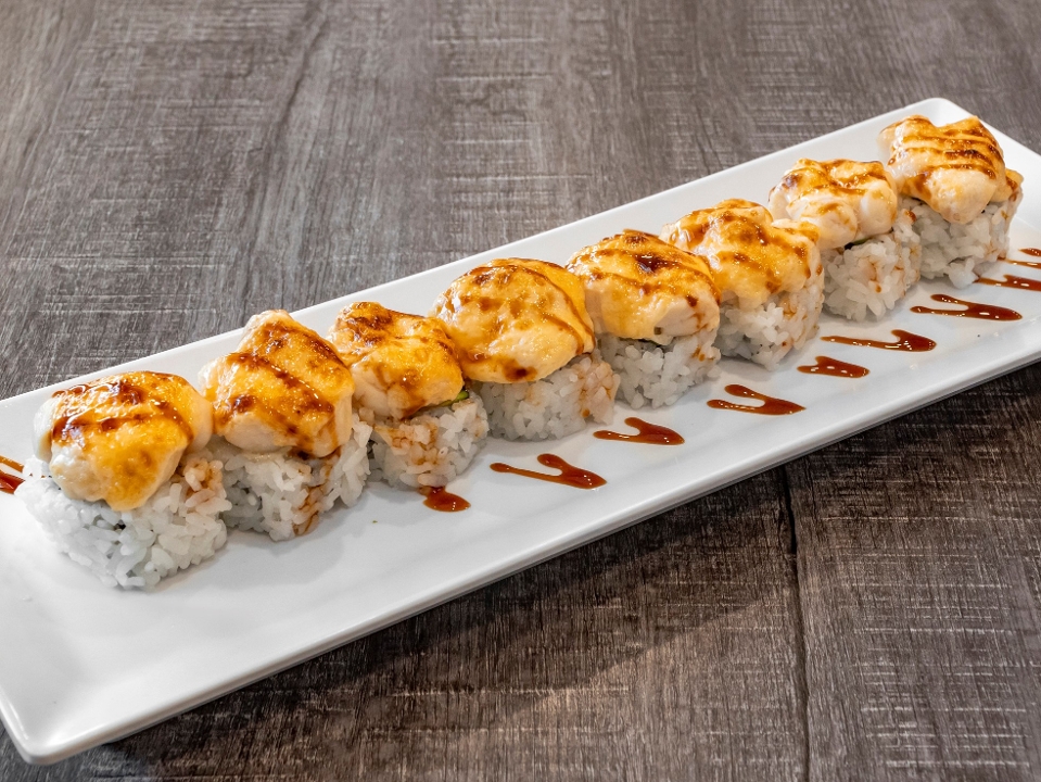 Baked scallops with mayo sauce on top of California roll with eel sauce, masago, and green onion