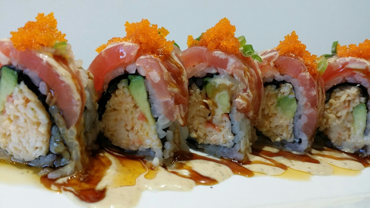 Spicy shrimp & crab and avocado, topped with salmon, eel sauce, chili oil, creamy sauce, masago, and green onion