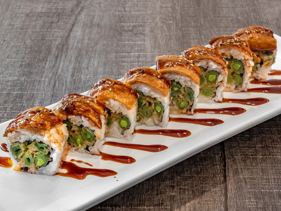 Green bean tempura roll, topped with Inari (bean curd), with sushi sauce and chili oil