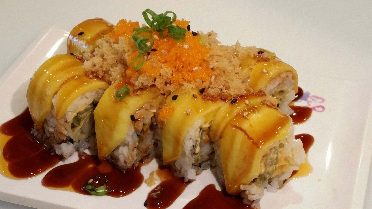 Veggie tempura roll, topped with mango, sushi sauce, and crunchy flakes