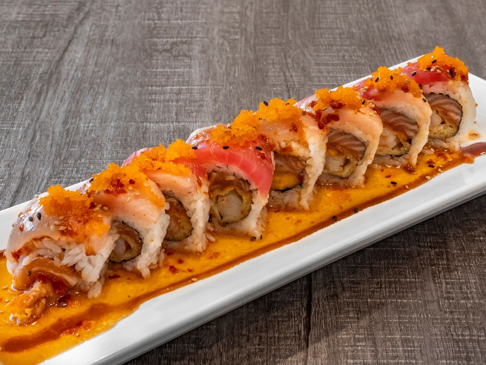 Tempura roll stuffed with Tuna, Salmon, Albacore, Yellowtail, avocado, and cream cheese; served with eel sauce