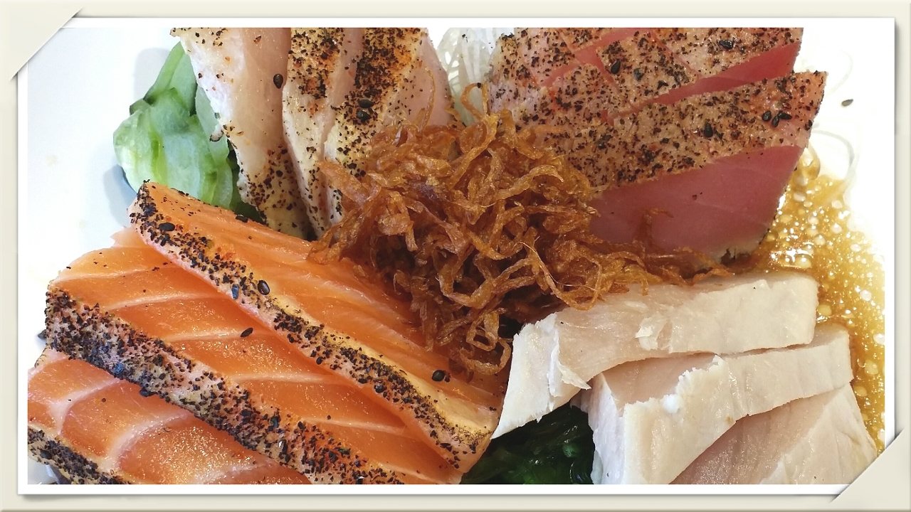 4 kinds of seared fish sashimi over 4 kinds of salads with spicy ponzu sauce and fried onion