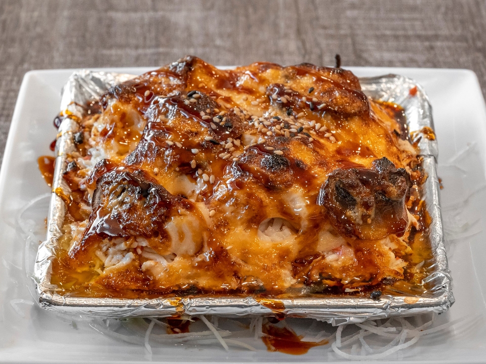 Baked scallops, imitation crab, and mushroom with mayo, topped with masago, and eel sauce