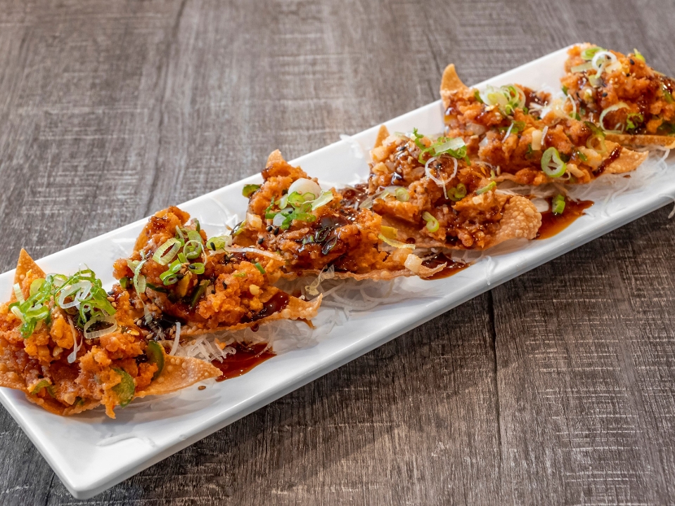 Spicy tuna mixed with white onion, jalapeño, masago, and mayo on top of crispy wontons with eel sauce and spicy mayo
