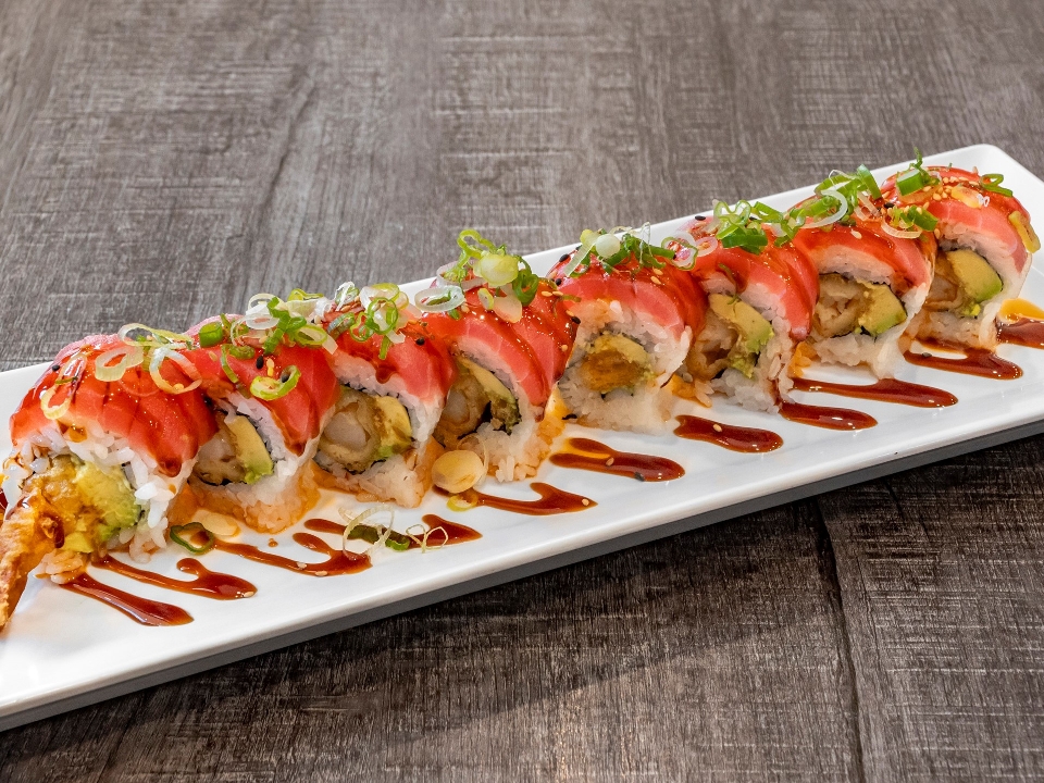 Shrimp tempura and avocado, topped with tuna, green onion, eel sauce and chili oil