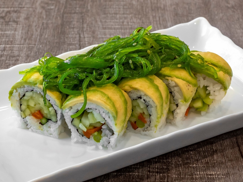Vegetable roll stuffed with avocado, cucumber, asparagus, and yamagobo; topped with seaweed salad