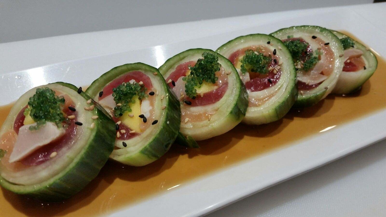 [Roll with no rice] Assorted fish, wasabikko, mango, and avocado; wrapped with cucumber and yuzu ponzu sauce on top