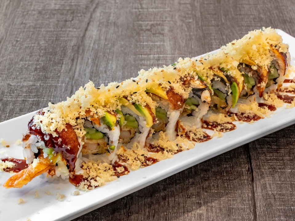 Shrimp tempura, cucumber with unagi, avocado, crunchy flake, and eel sauce on top