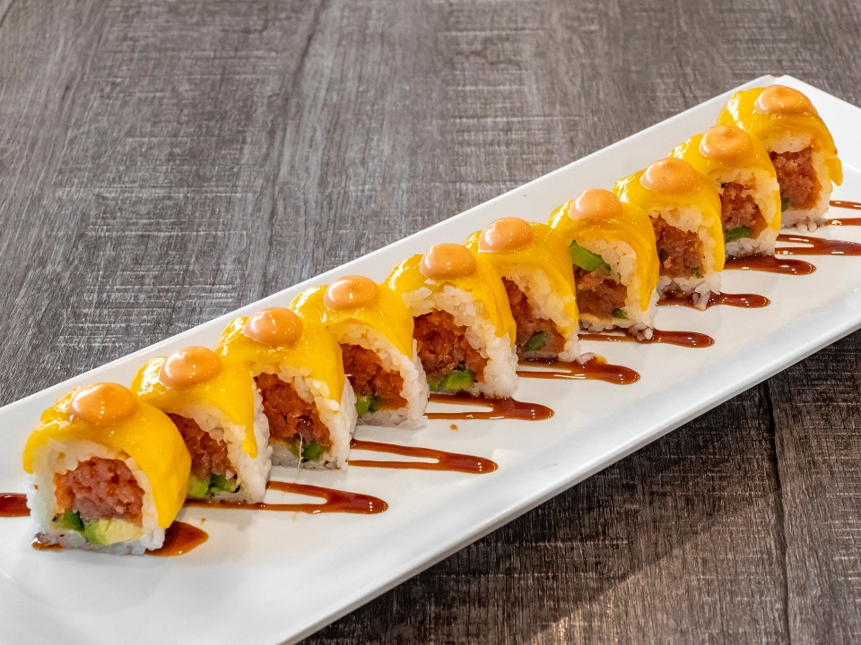 Spicy tuna, avocado, and fresh jalapeño in soy paper; topped with mango, spicy mayo, and eel sauce