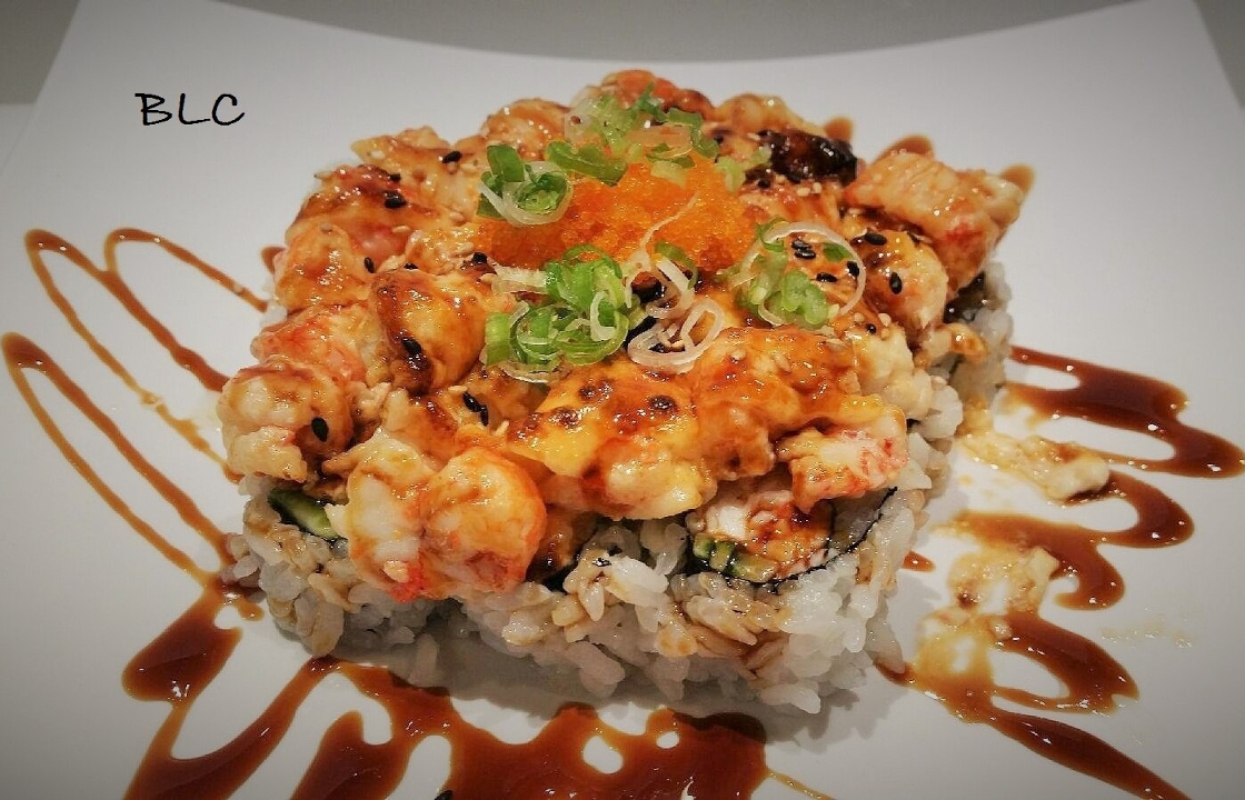 Baked langostino with butter and spicy mayo over California roll; with avocado, eel sauce, masago, and green onion